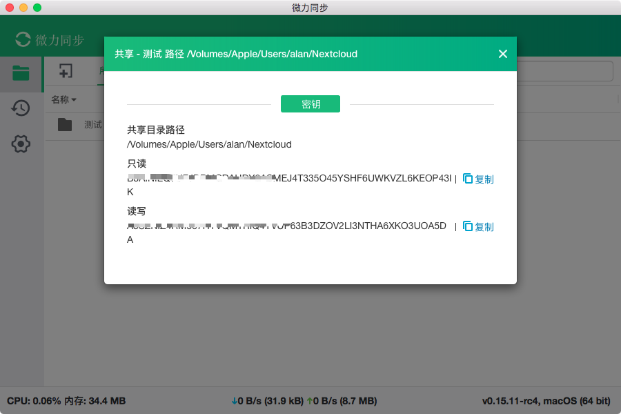 - 同步任务的建立只需要新建标准文件夹即可,新建后可根据只读或读写的不同需求使用不同的密钥。