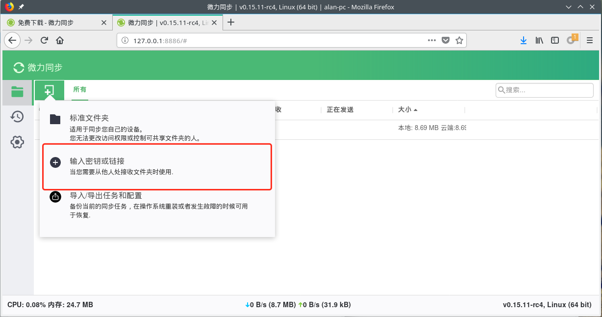 - 需要远程同步的文件夹只需要根据提供密钥导入,选择本地文件夹即可。